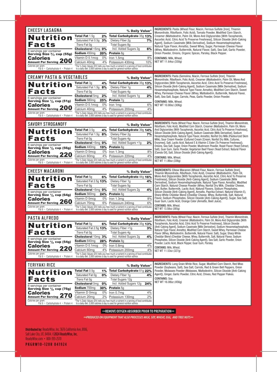 - 2 pouches of Cheesy Lasagna (12 total servings)